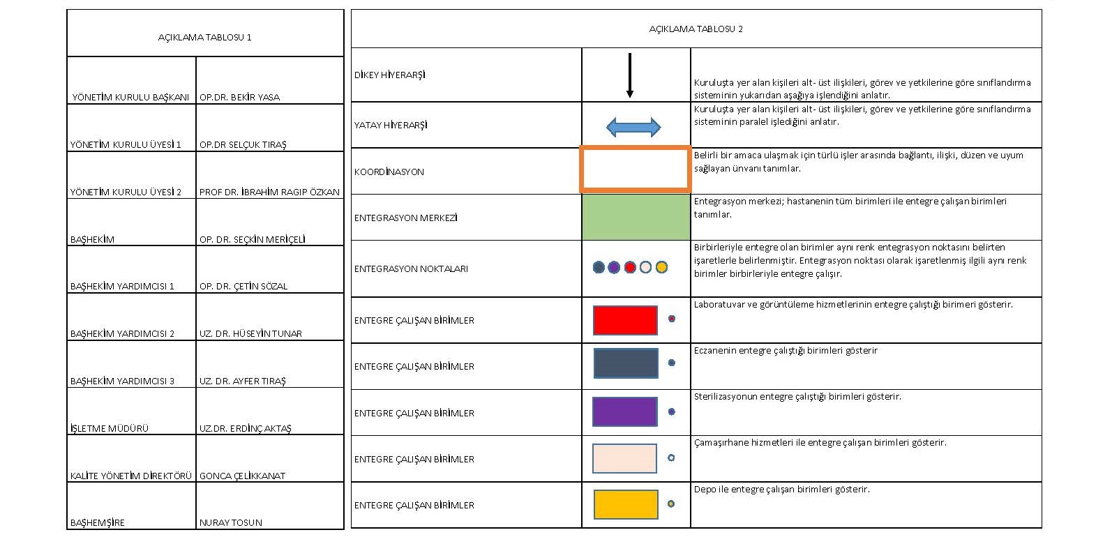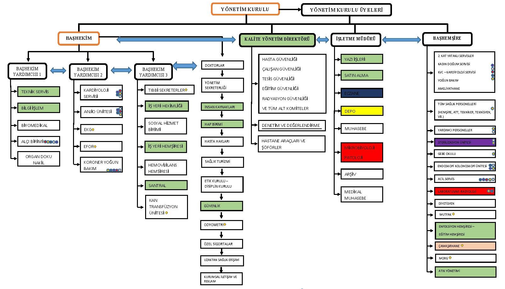 Kurumumuzda çok sayıda personelin çalışması, personelin çalışmalarını gruplandırmak ve bir disiplin içinde amaca uygun olarak yönetmek ve karar vermede zaman kaybı yaşanmaması amacı ile birimler olarak dikey (hiyerarşik) konumla yetkililelerine bağlıdır. Hastane Müdürü, Kalite Yönetim Direktörü ve Başhemşire, Başhekime dikey olarak bağlı olup Hastanemizin organizasyon yapısı KU.YD.01 Organizasyon Şemasında belirtilmiş olup en üst basamağında Yönetim Kurulu Başkanı bulunmaktadır.